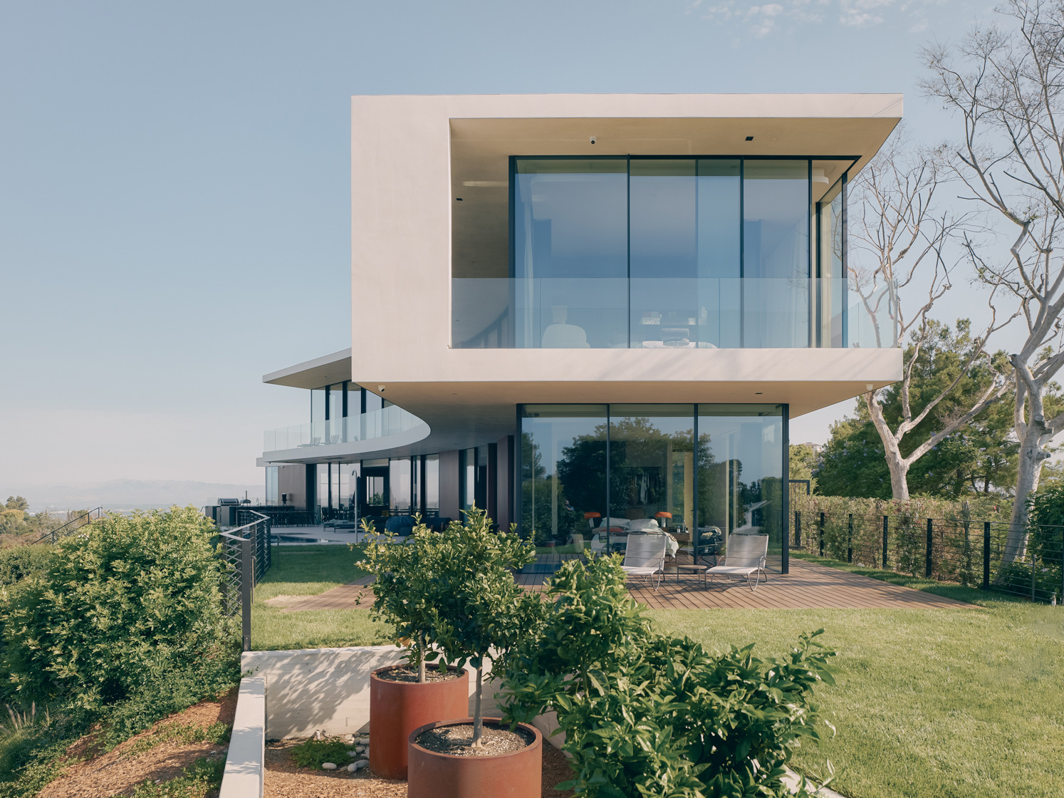 its natural surroundings. Using a refined palette of concrete, glass, and wood, the house balances raw modernity